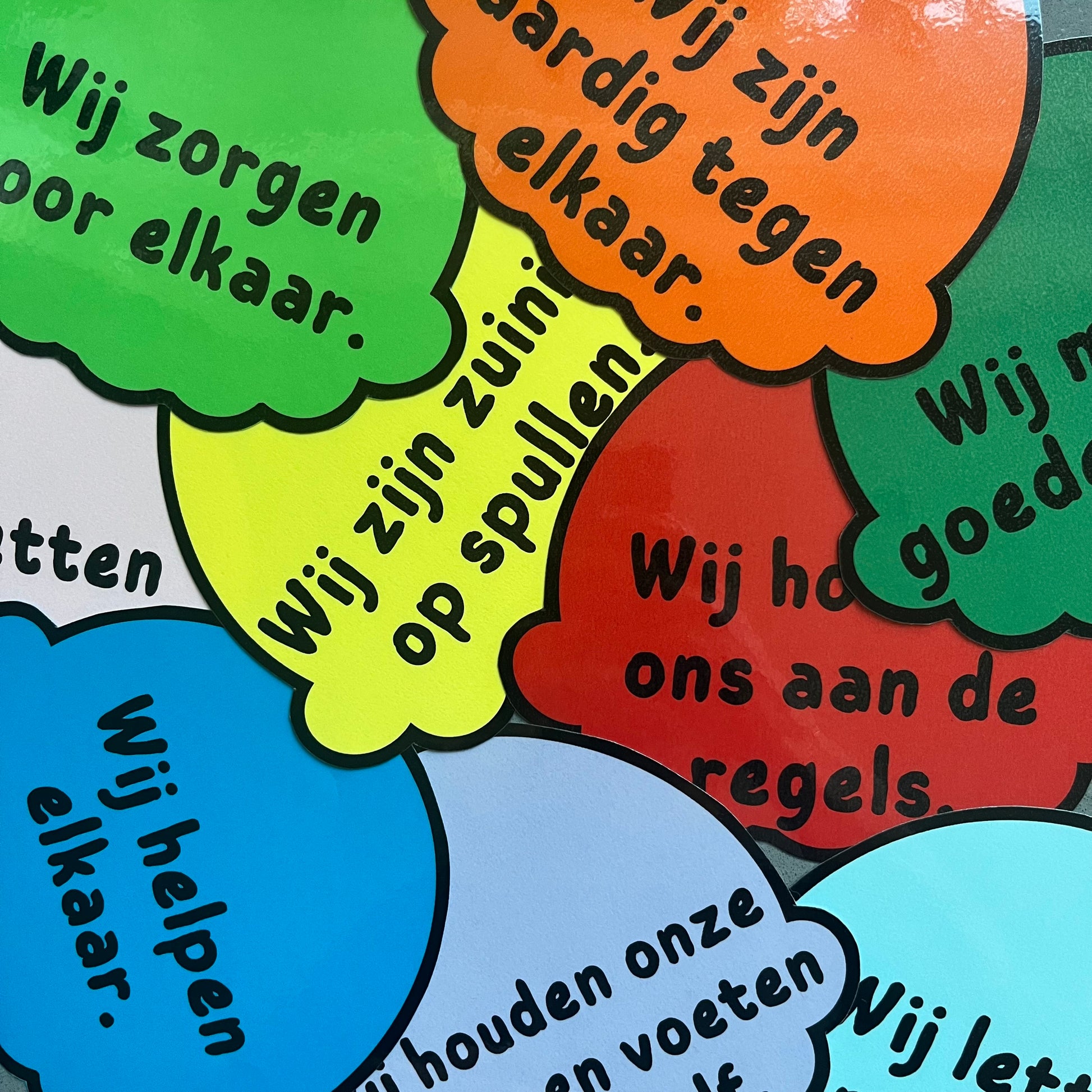 Alle bolletjes zijn wit met zwarte rand en zwarte tekst zodat je zelf kleurencombinaties kan maken door ze op jouw favoriete kleur papier uit te printen.