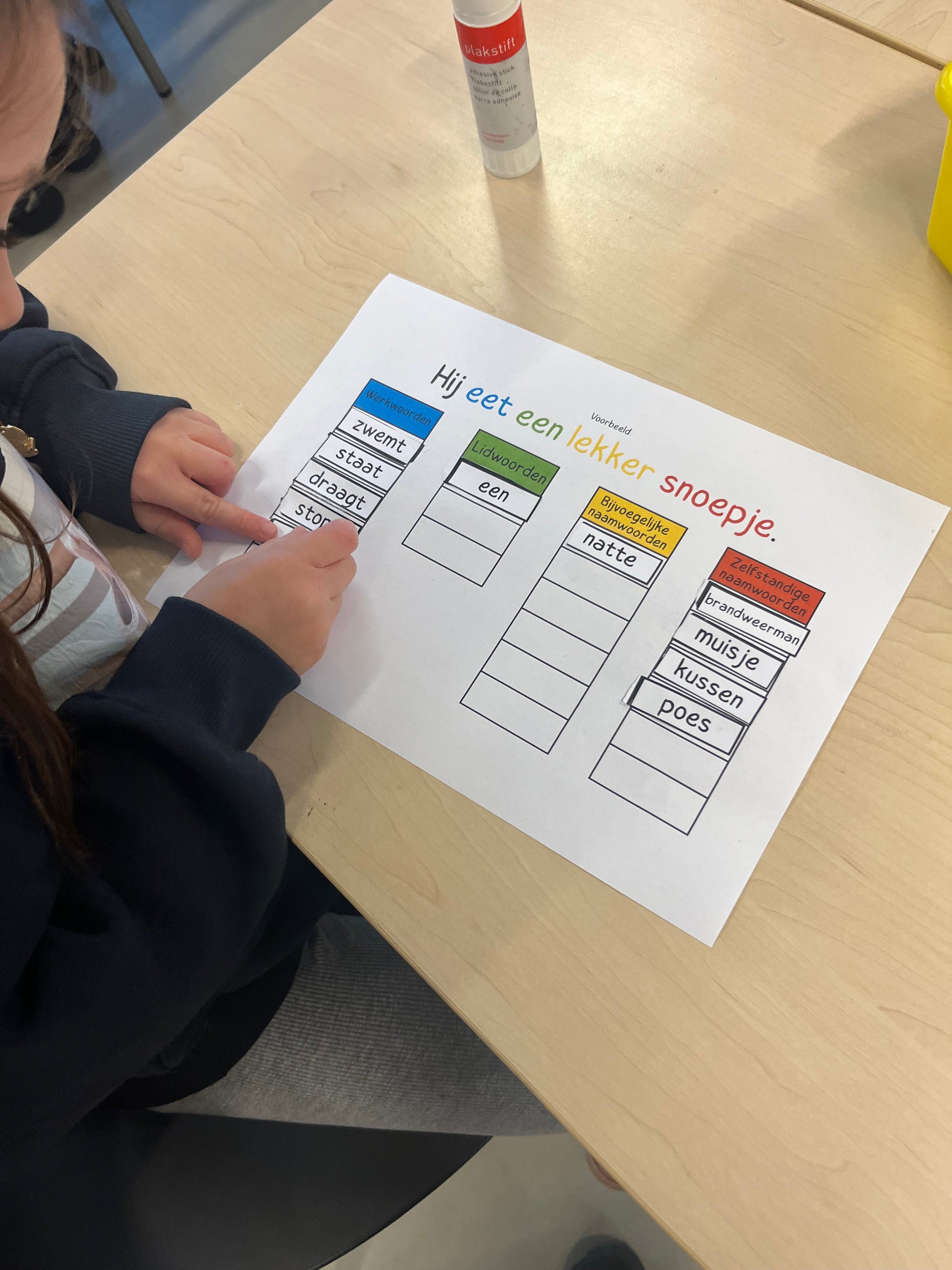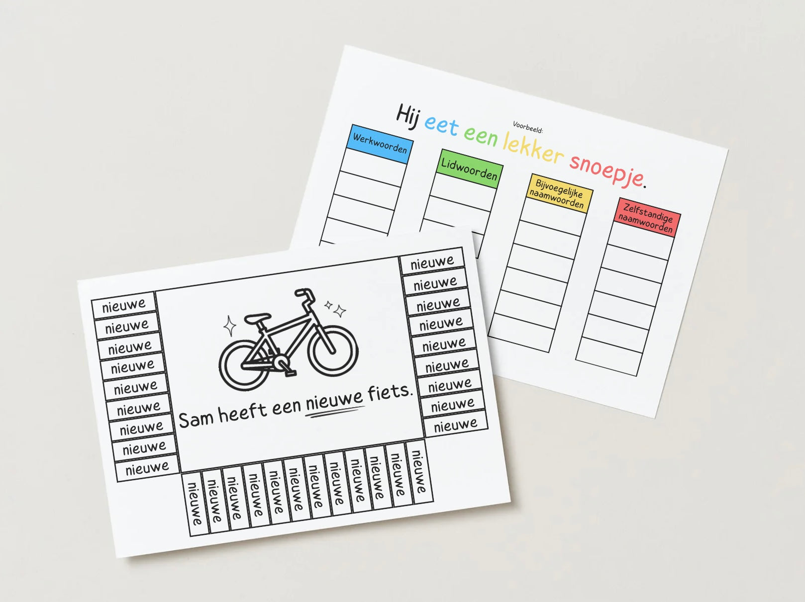 Dit bestand bestaat uit 2 antwoordbladen (met en zonder voorbeeld) en 21 bladen met daarop een zin en scheurwoordjes.